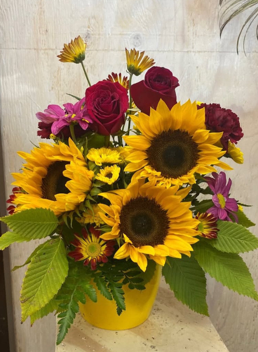 Celebrate the warmth and beauty of fall with our “Autumn Radiance” bouquet. Bursting with vibrant sunflowers, deep red roses, and rich autumn-hued blooms, this arrangement captures the golden glow of the season. Perfect for brightening a home, gifting a loved one, or adding a cozy, cheerful touch to any space. The lively mix of textures and colors evokes crisp autumn days and the comforting richness of fall.